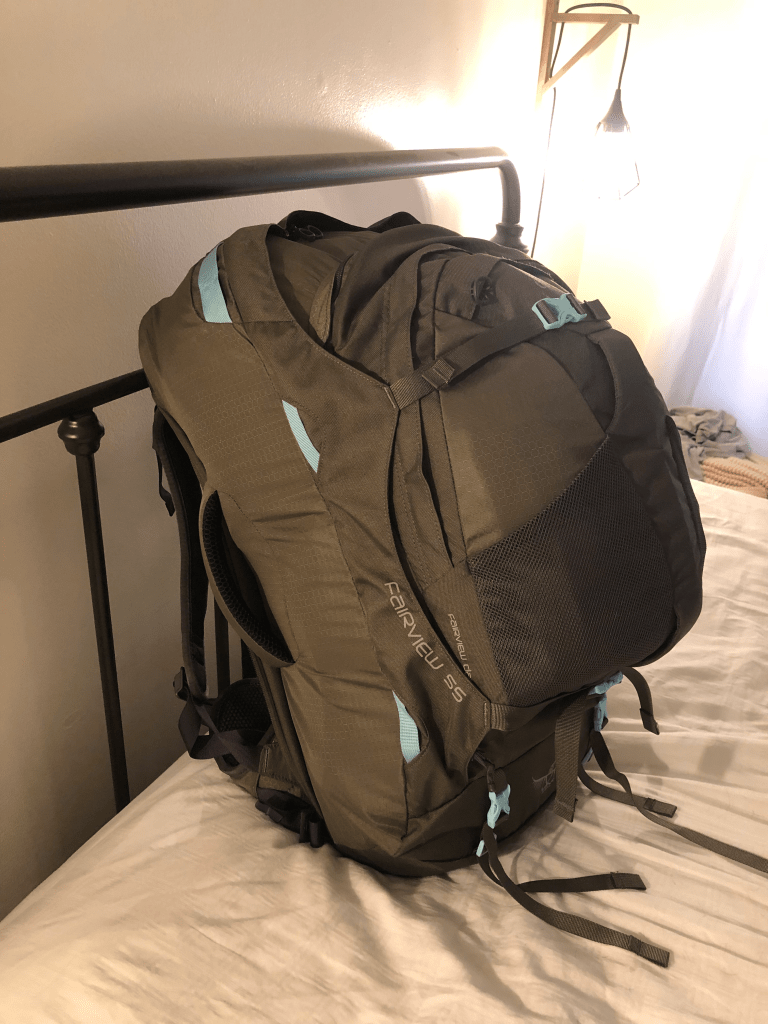 My go-to is the Osprey 55L backpack. It’s the perfect carry-on size, comfortable to wear, and surprisingly spacious. It has great back support and a detachable day pack that zips onto the front. You can also completely zip up the straps so you can check it if you want! Look for a bag with multiple compartments, durable zippers, and comfortable straps.